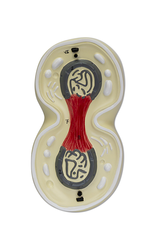 Mitose 8 Partes BI011 é um modelo anatômico composto por 8 partes representando as principais fases da mitose, processo fundamental de divisão celular. Ampliado aproximadamente 10.000 vezes, o modelo é montado sobre uma base de polímero, numerado e pintado à mão, facilitando a compreensão da sequência correta das etapas mitóticas e a identificação das estruturas celulares envolvidas.
