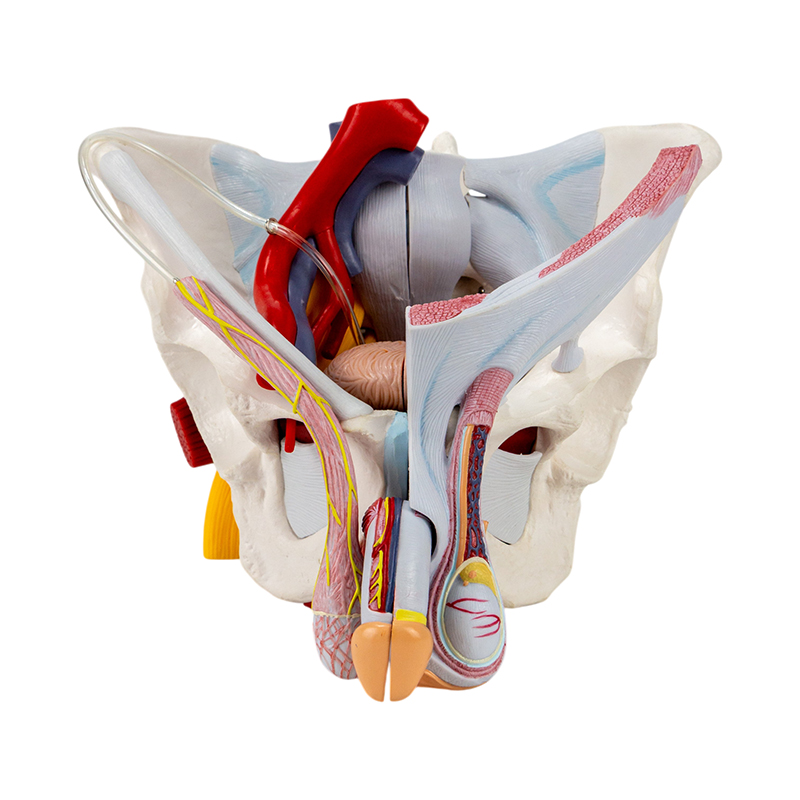 O modelo de pelve masculina ES34 é composto por 7 partes e fornece uma visão detalhada das relações entre ossos, ligamentos, vasos, nervos, músculos do assoalho pélvico e órgãos pélvicos masculinos, incluindo os genitais externos.