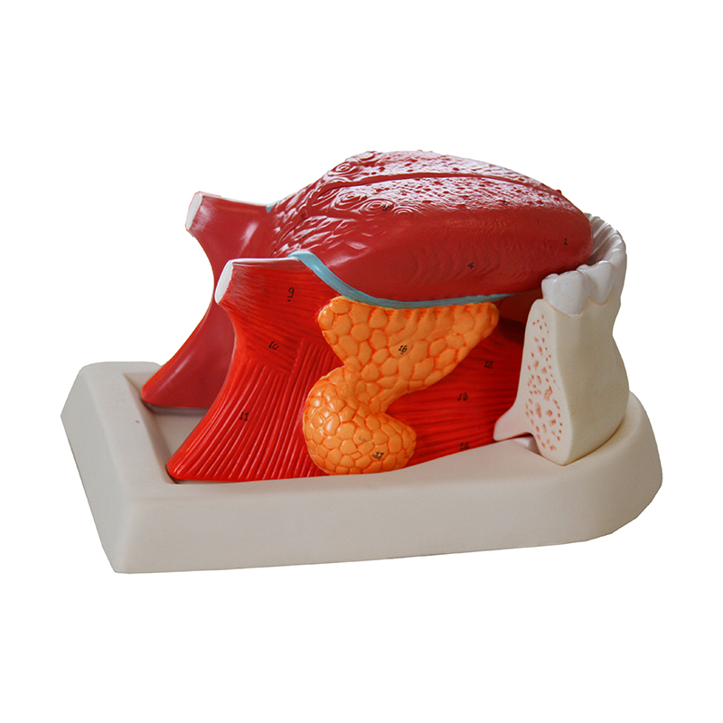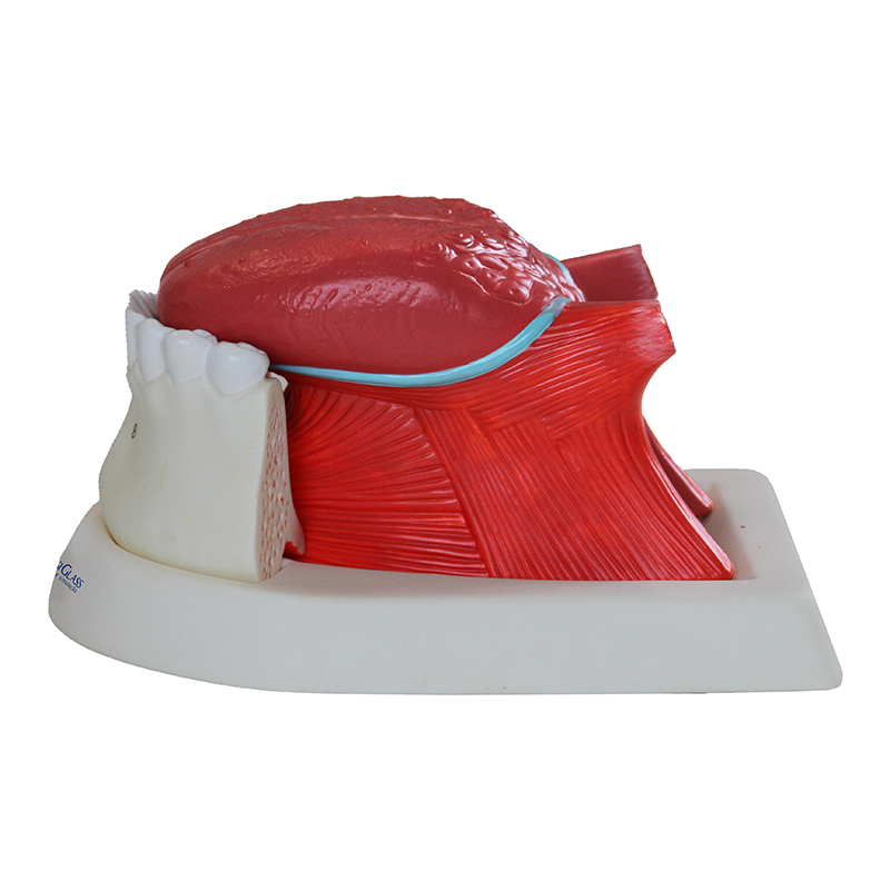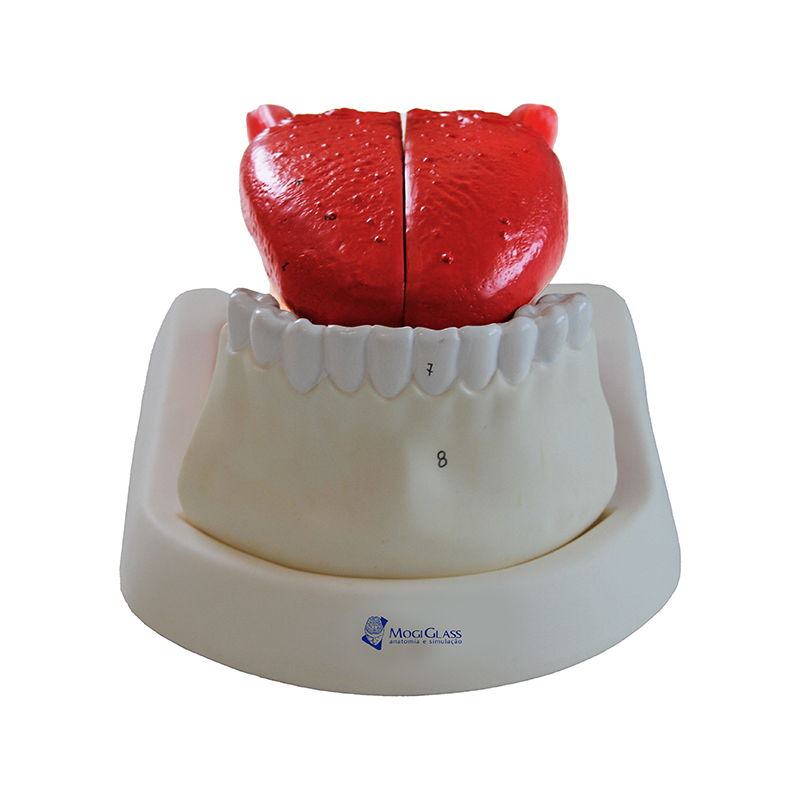Lingua ampliada 2.5 vezes 3 Partes DE20 é um modelo anatômico que representa a língua humana ampliada 2.5 vezes o tamanho natural, dividida em 3 partes, demonstrando com riqueza de detalhes as estruturas desde a mandíbula até o segundo molar.