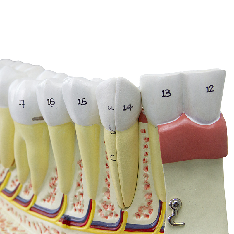 O modelo possibilita a remoção de uma porção da mandíbula, permitindo a visualização das raízes dentárias e da estrutura óssea interna, bem como a remoção e dissecação longitudinal dos dentes canino e molar, possibilitando a observação detalhada das raízes, polpa dentária e nervos.