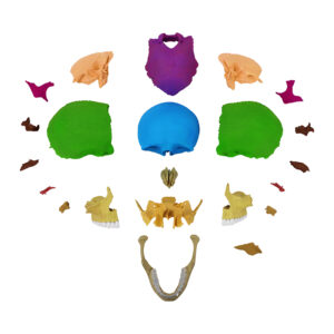 Crânio de encaixe em 22 Partes Cores didáticas CR291 é a versão didática do modelo de crânio humano articulado (cranium humanum), composta por 22 partes individuais, permitindo o estudo detalhado da estrutura óssea craniana.
