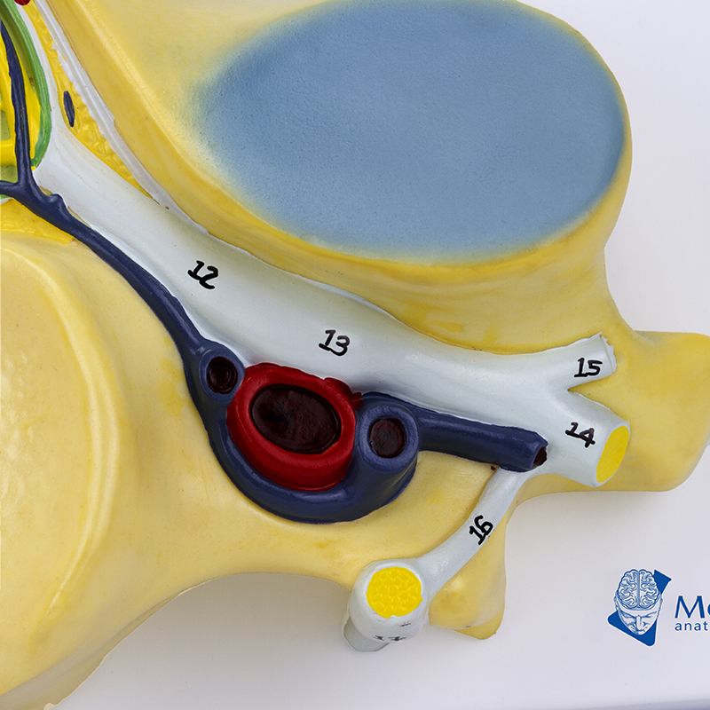 5ª Vertebra Cervical ampliada 7 vezes CL78, é um modelo com 7 vezes o seu tamanho natural, apresenta com elevado nível de detalhe a sua estrutura anatômica. O modelo inclui um corte transversal da medula espinal (medulla spinalis), evidenciando claramente a substância cinzenta (substantia grisea), a substância branca (substantia alba), ramos nervosos, gânglio espinal (ganglion spinale), além de vasos sanguíneos.