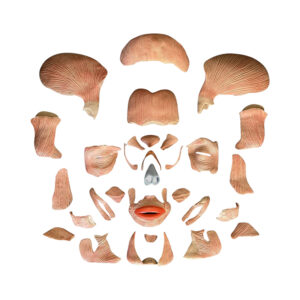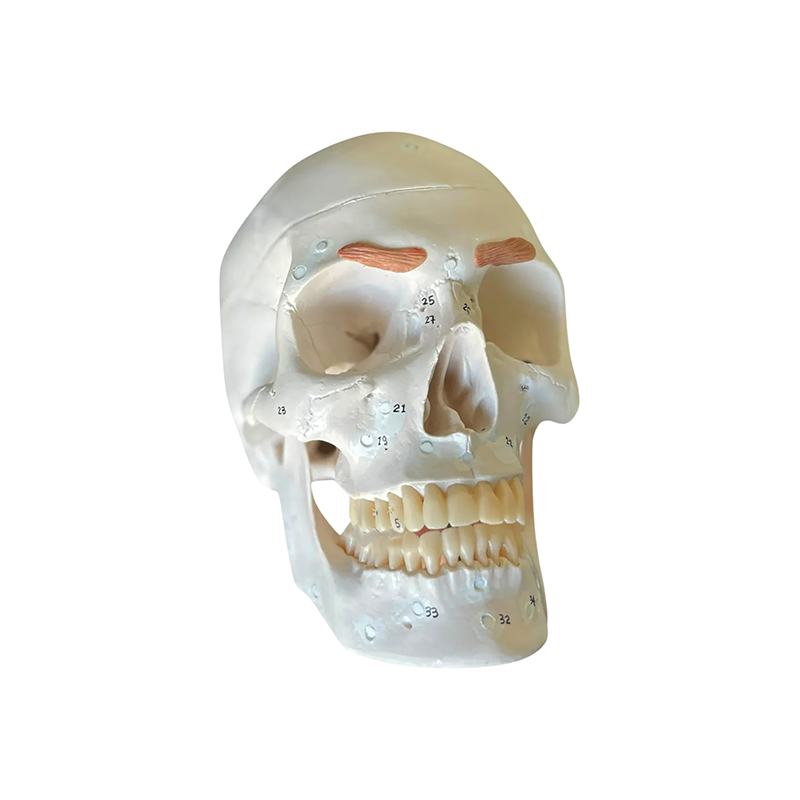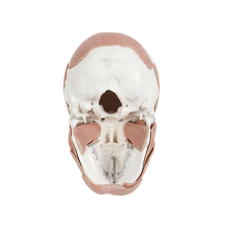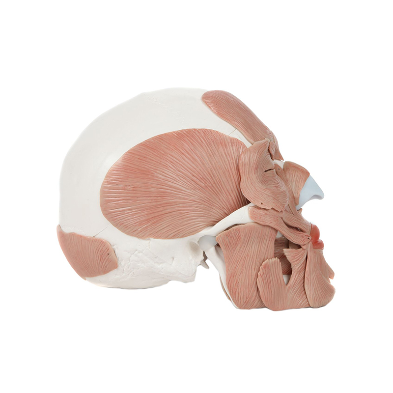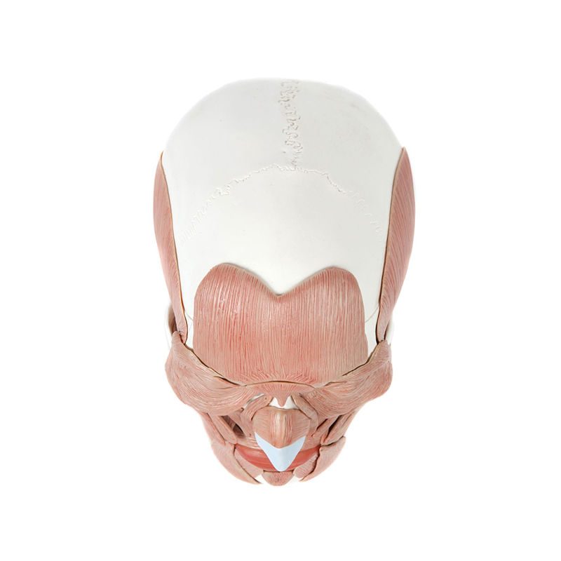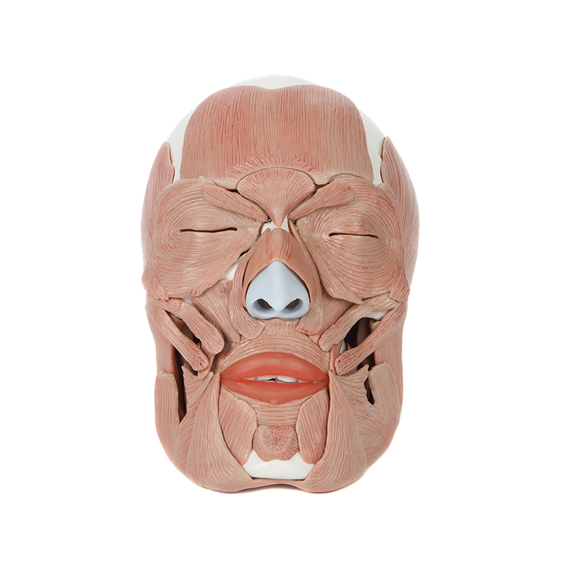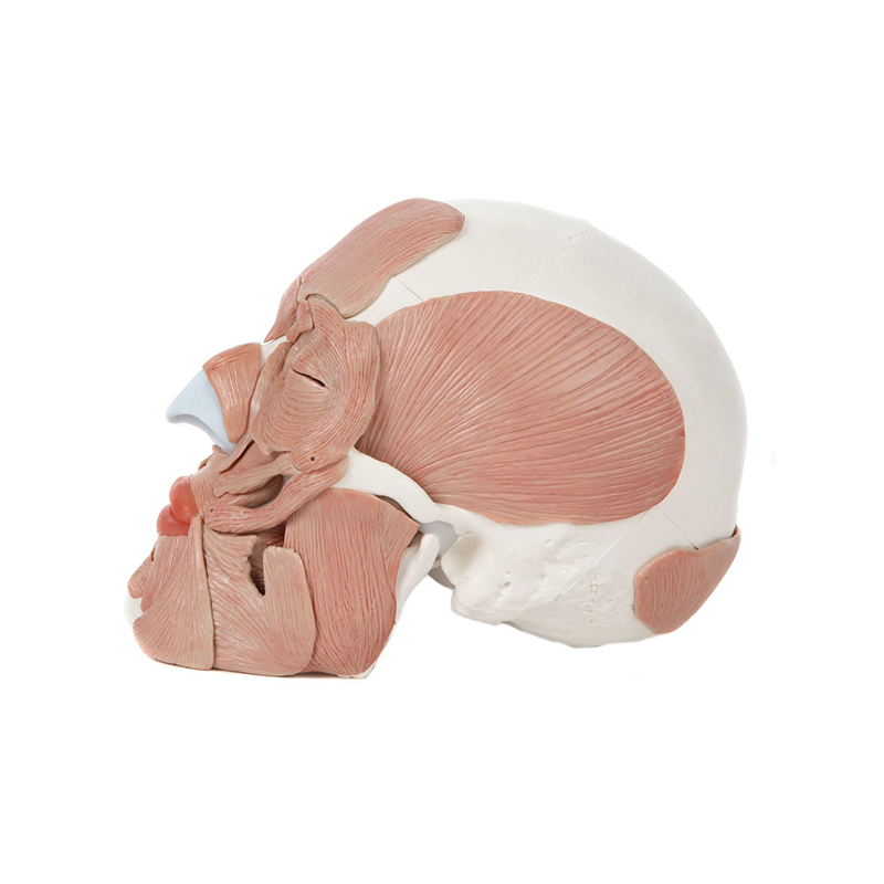 Altamente educativo, com músculos faciais e mastigatórios removíveis, é um modelo único e extremamente detalhado da musculatura facial em relação ao crânio. O crânio é moldado em resina branca e tem o tamanho correspondente a um adulto. A calota craniana (parte superior) pode ser removida para que a base do crânio (basis cranii interna) possa ser estudada.