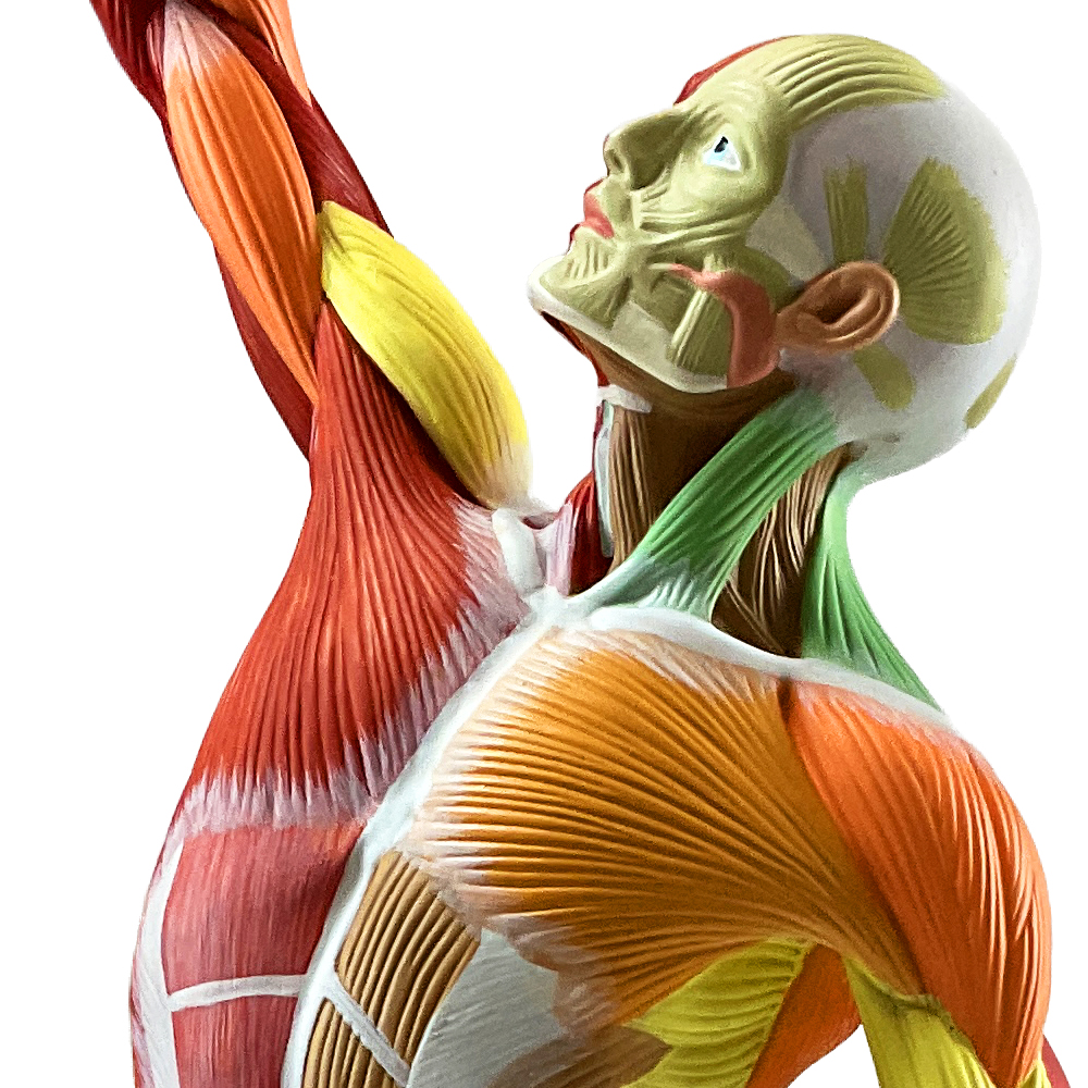 Representação detalhada em cores didáticas da anatomia muscular superficial do corpo humano (corpus humanum). Fabricado em material sintético durável, de alta resistência. O modelo oferece um nível de detalhe essencial para o estudo da anatomia humana. Referências e marcações que facilitam o estudo, modelo pintado à mão.