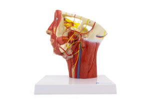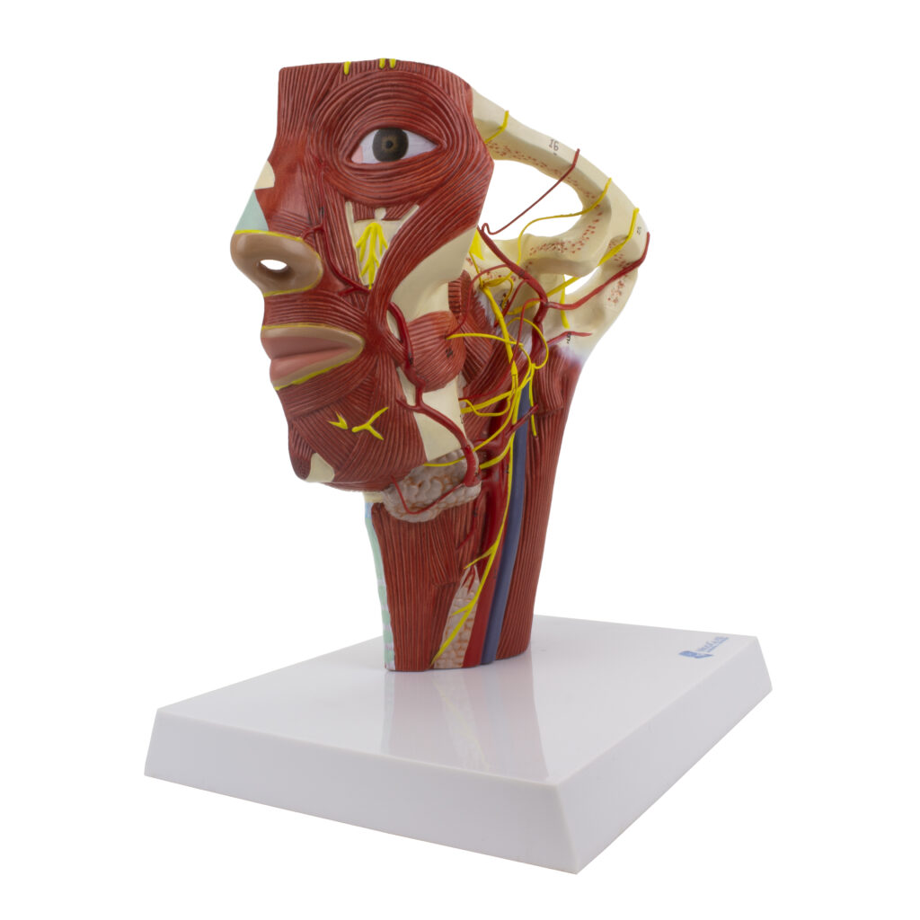 Musculatura da Cabeça com Artérias CA127 é um modelo em tamanho natural apresenta detalhadamente a artéria carótida externa esquerda (arteria carotis externa) e seus ramos terminais, oferecendo uma representação fiel para o estudo aprofundado da vascularização da região da cabeça e do pescoço.