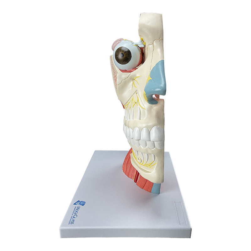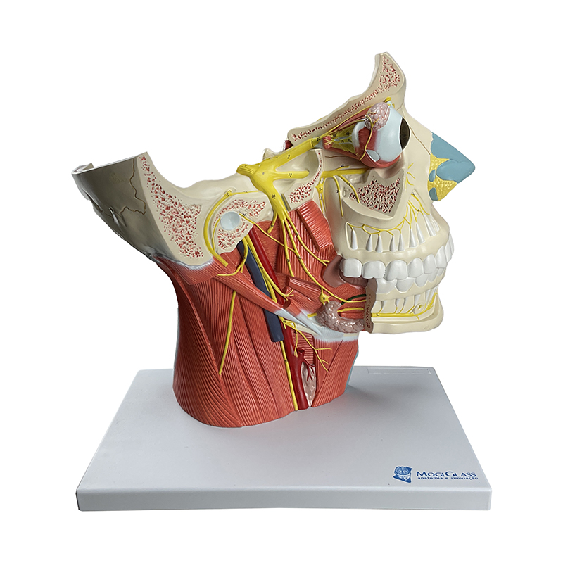 Musculatura da Cabeça com Nervos Craniano e Autônomo CA126 é um modelo detalhado que apresenta a dissecação de metade da cabeça humana, ampliada 2.5 vezes o tamanho natural, permitindo estudo aprofundado das estruturas nervosas. Exibe com precisão os 12 nervos cranianos, seus ramos colaterais e nervos autônomos, além da secção mediana das vias respiratórias superiores e faringe.