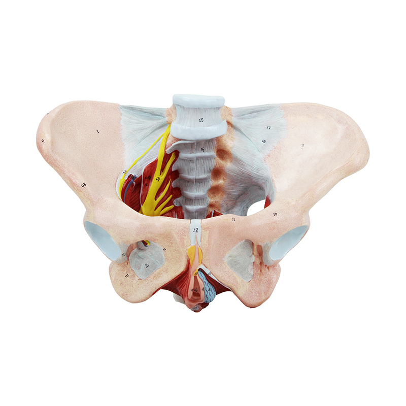 Pelve Feminina com ligamentos Vasos Nervo e Assoalho pélvico ES32 é um modelo anatômico em tamanho natural, altamente detalhado e pintado à mão, representando os órgãos genitais externos e internos, os ligamentos sacroilíacos (ligamenta sacroiliaca), os músculos do assoalho pélvico (diaphragma pelvis) e as redes nervosa e vascular sacral.