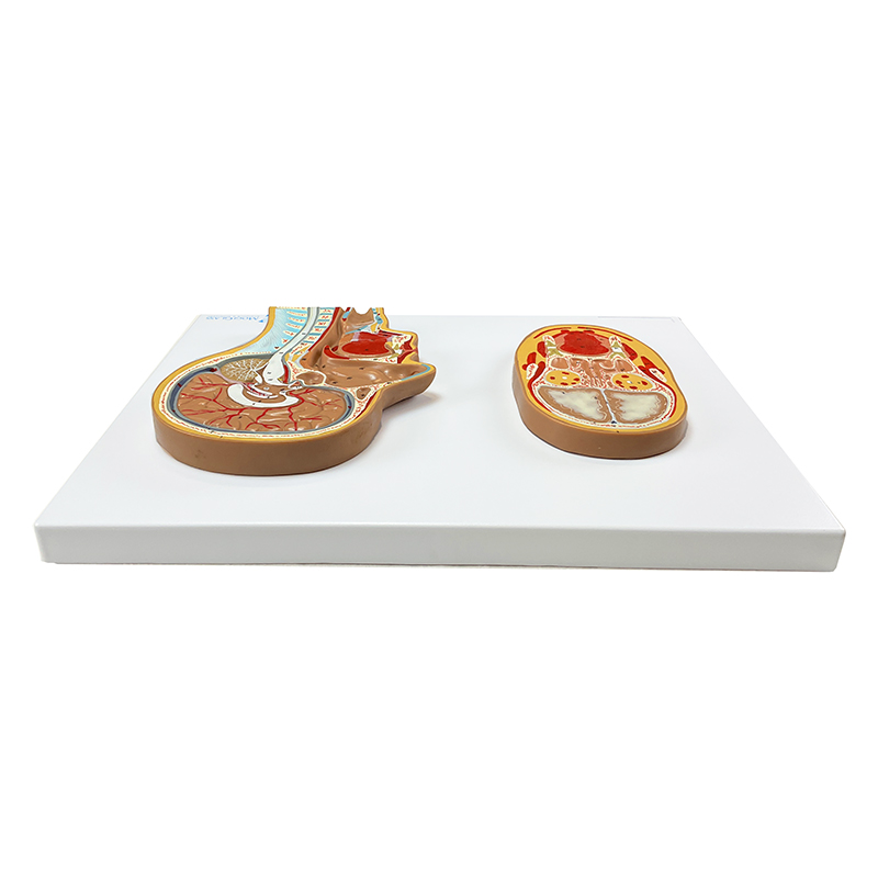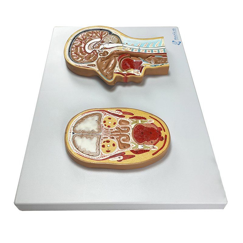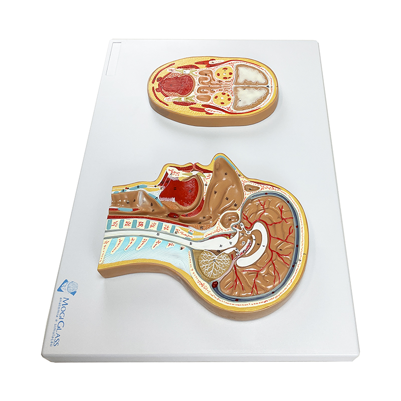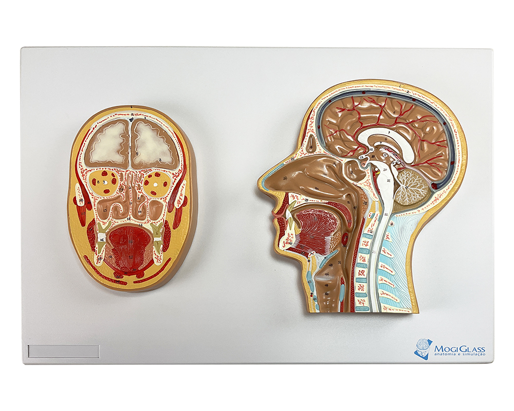 Seção Frontal e Lateral da Cabeça CA13 é uma representação em tamanho natural, em relevo, que apresenta com riqueza de detalhes as estruturas internas da cabeça e do pescoço, permitindo uma visualização clara e comparativa entre as secções frontal e mediana da cabeça humana.
